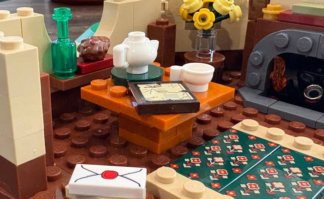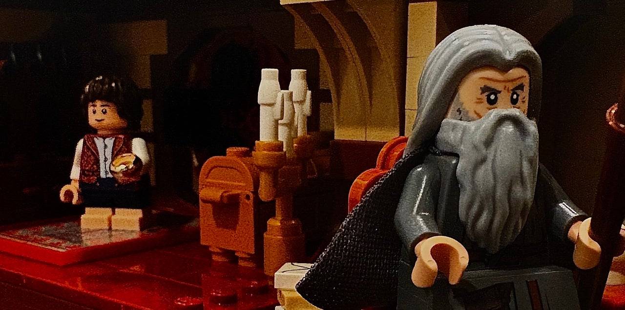 El set está lleno de referencias a las aventuras de Bilbo. El Cobrezamor espera en un cofre cerca de la puerta, mientras que el mapa gastado de Thorin descansa junto a una tetera. Una espada comparte el paragüero con una sombrilla hobbit.