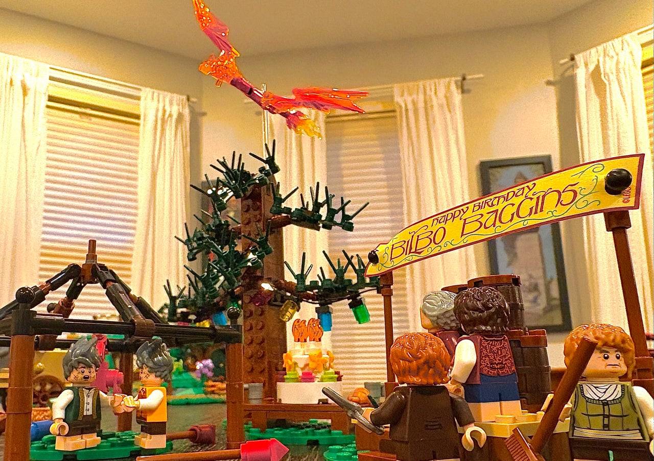 Construir la colina ondulante resultó inesperadamente táctil: las piezas verdes curvas en capas crean variaciones del terreno que hacen eco de la geografía inmersiva de la Tierra Media. El toque final es el árbol nudoso de Bolsón Cerrado que se extiende por la cima de la colina.