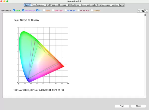 15,3-дюймовый дисплей с разрешением 1880p обеспечивает превосходную цветопередачу, покрывая 99% цветового охвата DCI-P3 и 100% sRGB. С пиковой яркостью 426 нит он хорошо показывает себя в различных условиях освещения, хотя при прямом солнечном свете возможности остаются ограниченными.